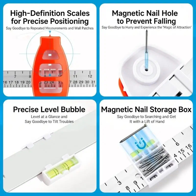 This versatile picture hanging tool features double mount option, high resolution measurement scale, nails holders, and an integrated levels indicates for effortless installation.
